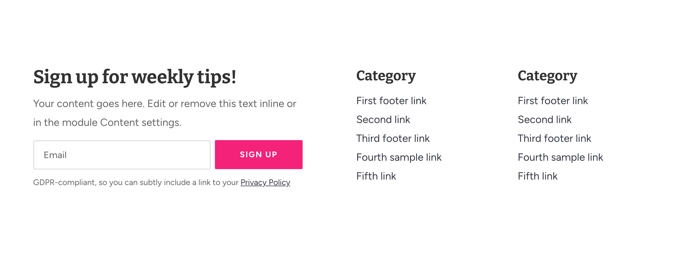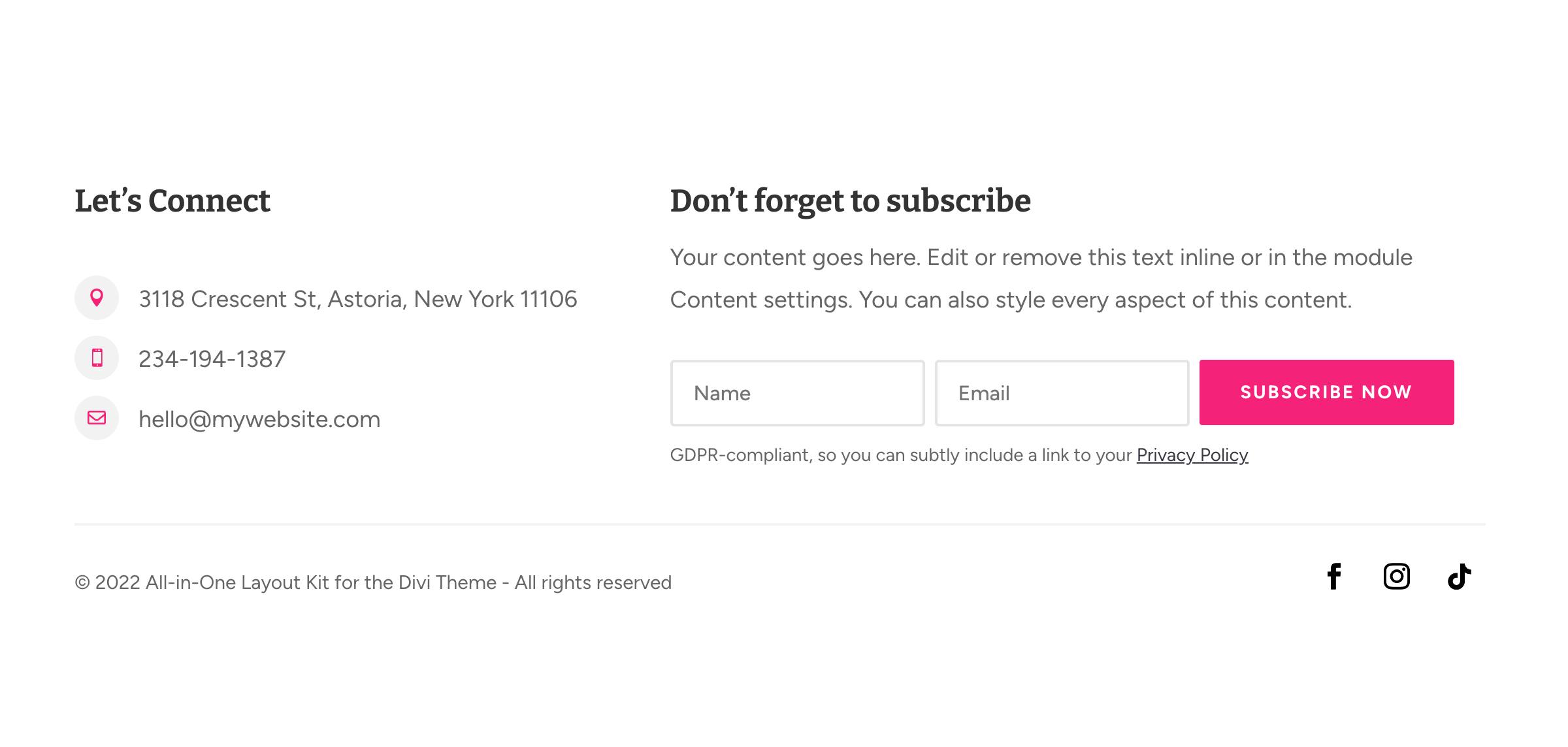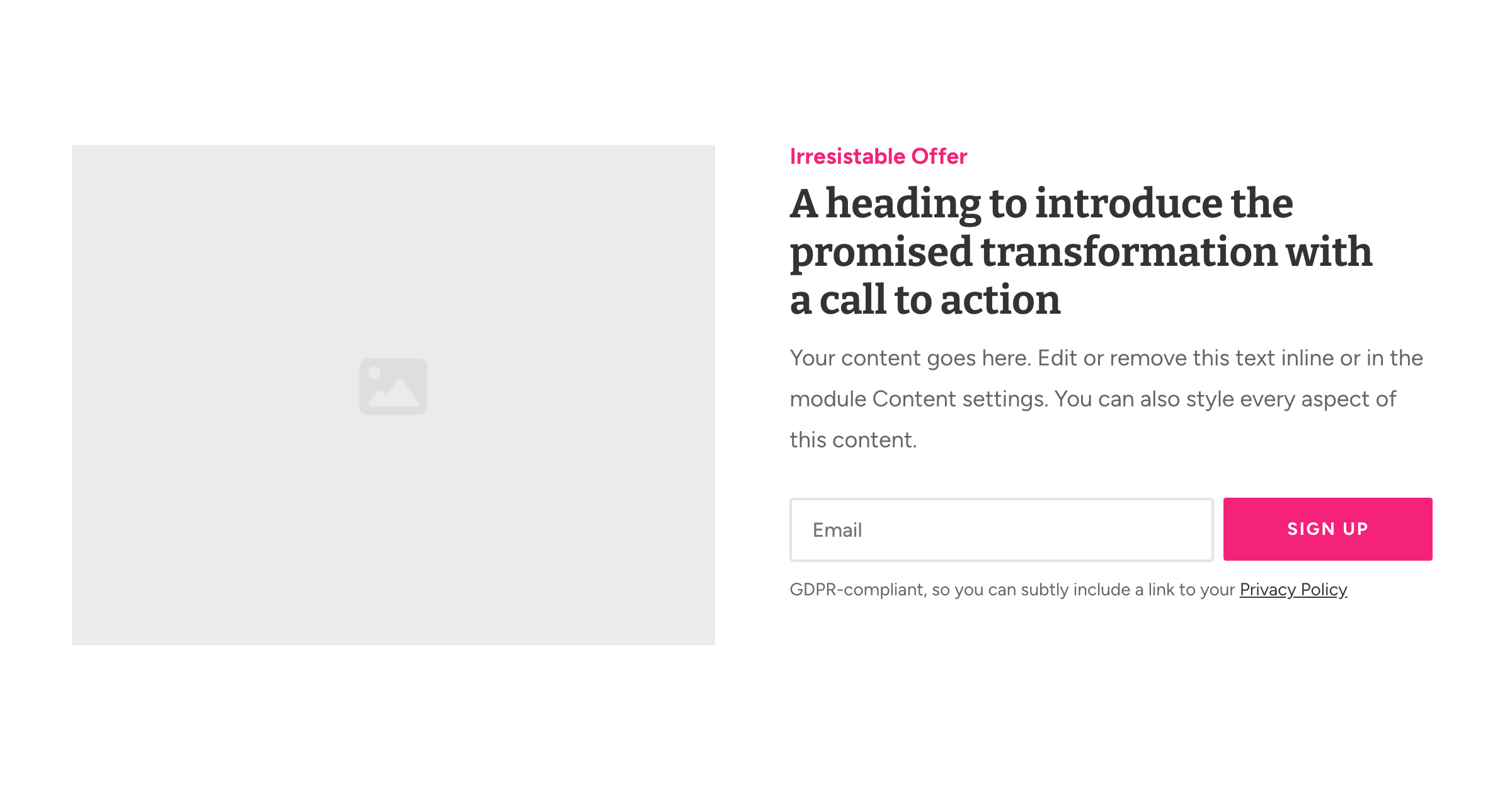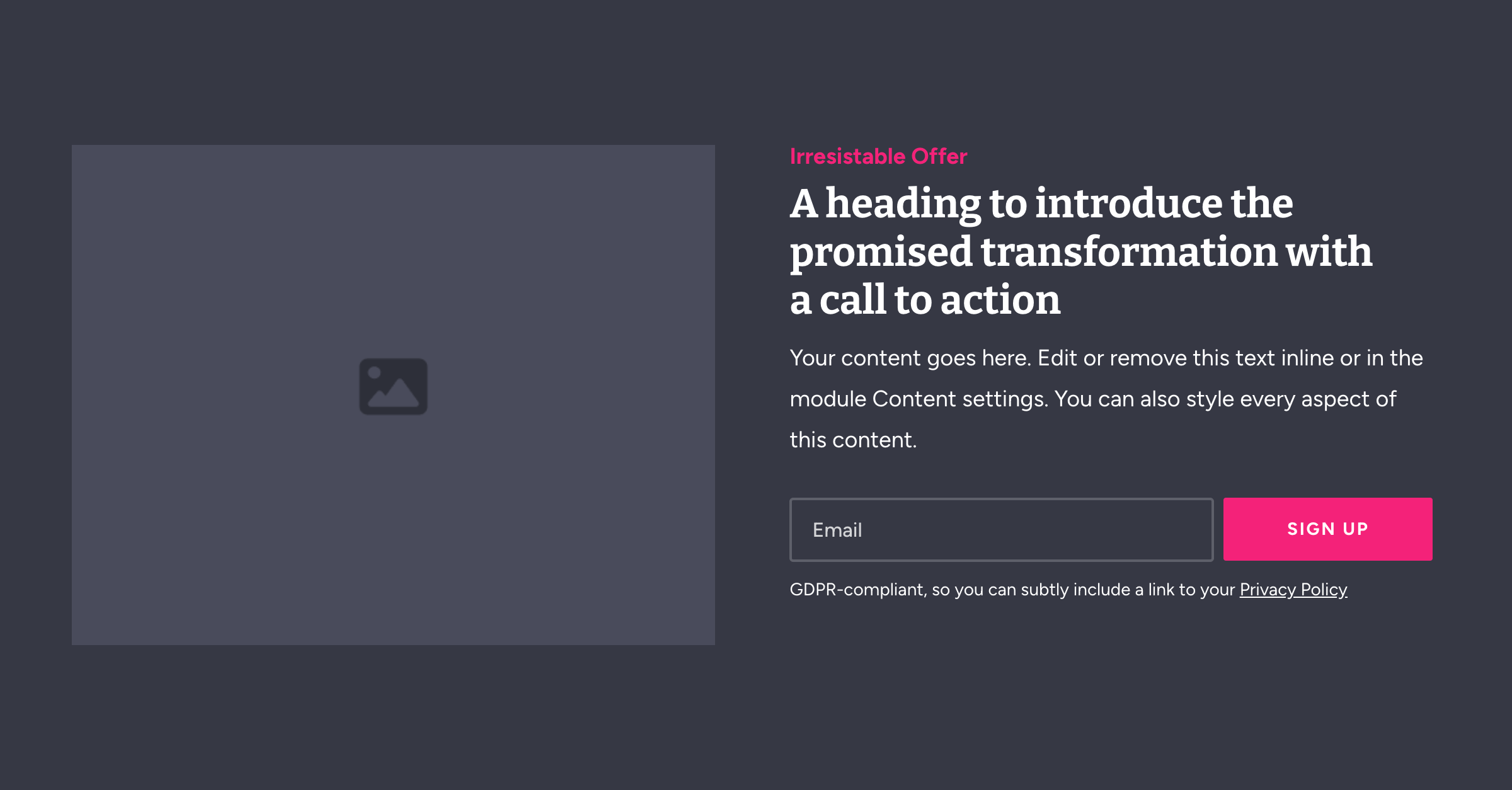 Milly contains a professional mailing list kit, complete with various pages and elements (just like this elegant opt-in module) to help you build an engaged community of clients and fans.